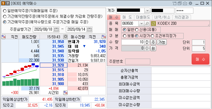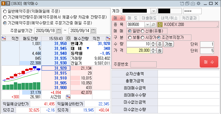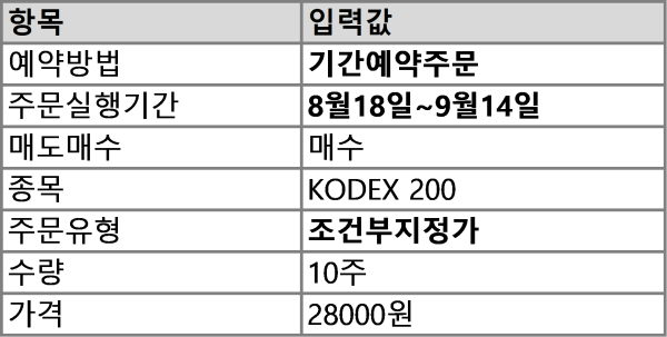 이제 8월18일~9월14일의 기간동안 매일 아침 장개시 시점에(08:30) 시장가 10주, 조건부지정가 10주의 매수주문이 자동으로 제출되며, 매일 10주는 시가, 10주는 종가로 체결될 것입니다. 둘을 합치면 20주, 약 60만원에 해당하는 금액을 매일 자동으로 매수하게 됩니다. 1주당 평균 매수 가격은 시가와 종가의 중간가격이 되겠죠.