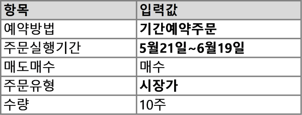 이제 투자 계획이 다 나왔으니 예약주문을 입력해 봅시다. 먼저 시가 체결을 위해 시장가 주문을 아래와 같이 입력합니다.