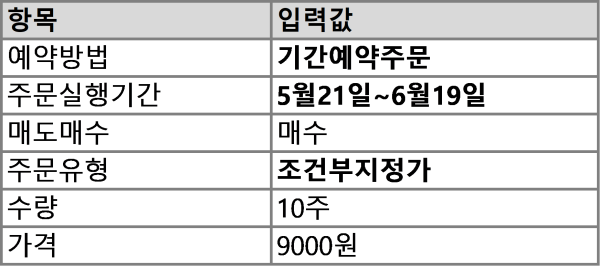 제가 사용하는 미래에셋대우증권의 경우 예약주문의 최대 기간이 1개월 정도이므로 오늘 날짜로 부터 최대 1개월까지만 예약주문을 등록할 수 있습니다. 그렇다면 기간이 만료되기 전에(위 예시에서는 6월 19일을 전후하여) 똑같은 방법으로 예약주문을 다시 등록해 주면 됩니다.