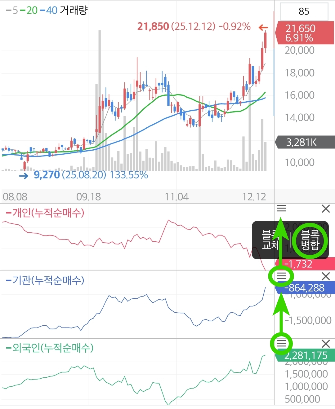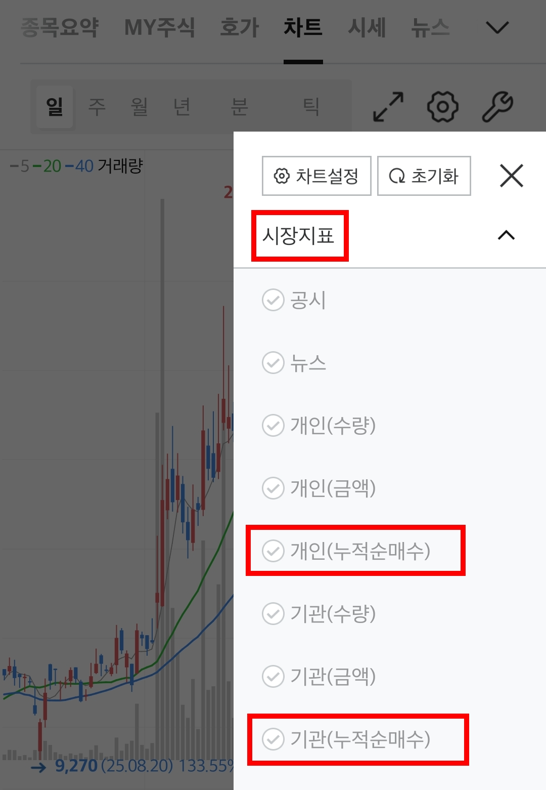 - MTS: 차트 화면 → 설정(⚙️) → 시장지표 → 누적순매수 항목 체크 → 블록 병합