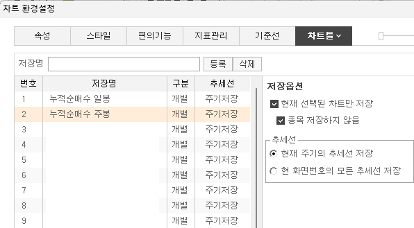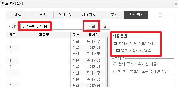 - 저장옵션에서 현재 선택된 차트만 저장, 종목 저장하지 않음 체크