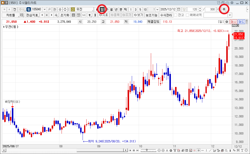 Step 1. 일봉 차트에서 설정(⚙️) 아이콘 클릭