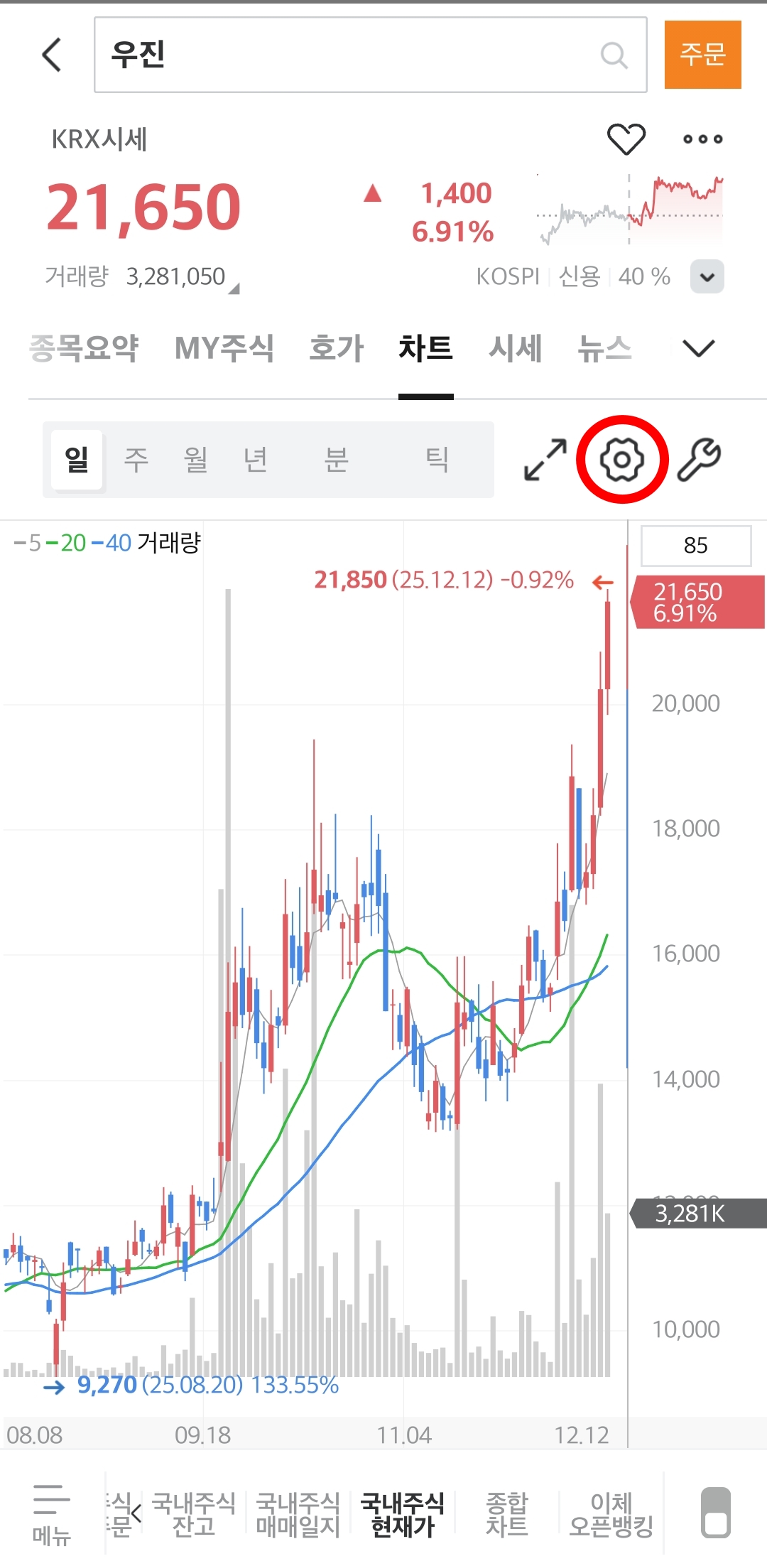 먼저 국내 주식 차트 화면에서 화면 우측에 있는 설정(⚙️) 아이콘을 터치합니다.