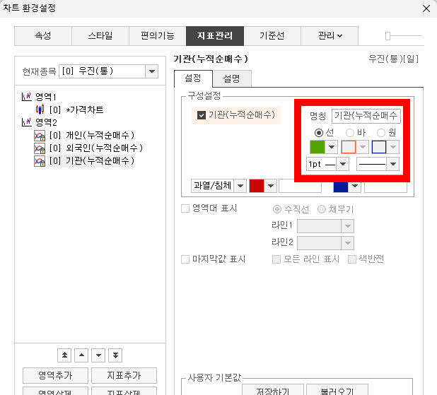 지표를 추가한 후, 좌측 영역 목록에서 해당 지표를 클릭하면 우측에 설정 패널이 나타납니다. 여기서 라인 색상, 굵기 등을 원하는 대로 변경할 수 있습니다. 설정이 완료되면 확인 버튼을 클릭합니다.