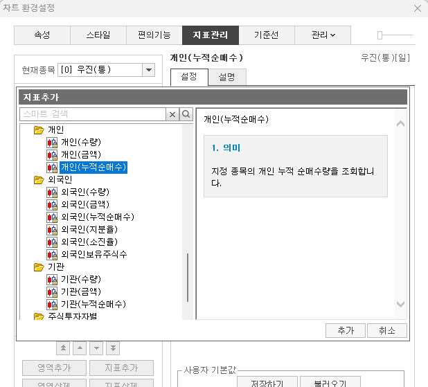 - HTS: 차트 화면 → 환경설정 → 지표관리 → 지표추가 → 누적순매수 선택 → 차트틀 저장