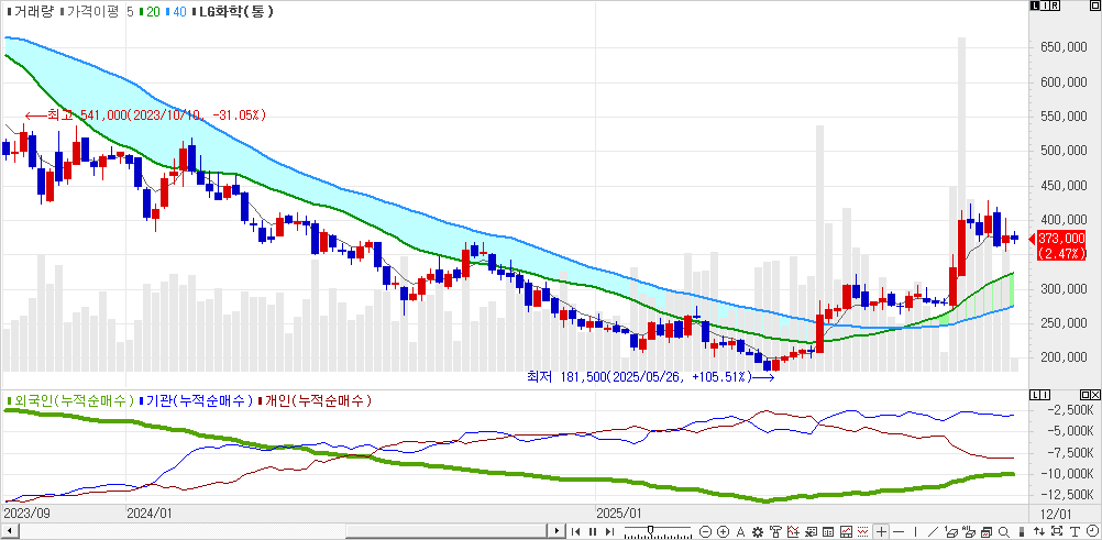 위 그림은 LG화학의 외국인 누적 순매수(하단 녹색 라인) 예시입니다. 외국인 포지션이 완만한 V자 형태로 바닥을 만들고 상승으로 전환되는 구간에서, 주가도 함께 반등하는 흐름이 나타납니다.