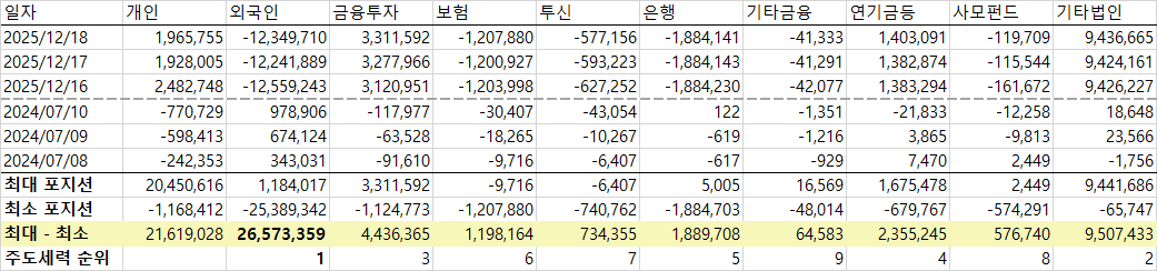 위 표는 2024-07-08부터 2025-12-18까지 삼성전자의 투자주체별 포지션과 포지션 변동폭을 정리한 것입니다. 이 기간동안 외국인의 변동폭이 가장 크므로, 삼성전자의 주도세력은 외국인이라고 판단할 수 있습니다.