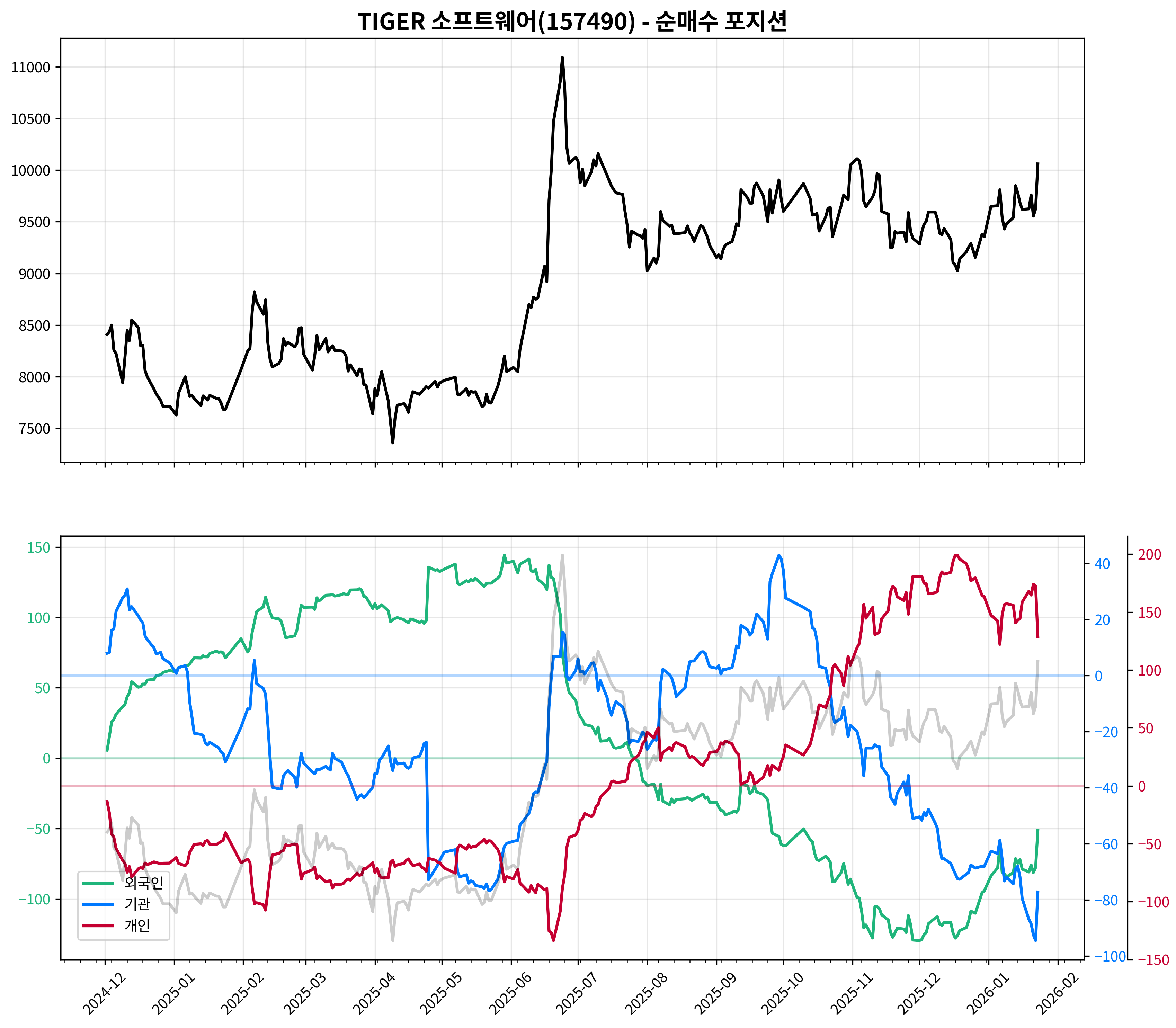 이번 글에서는 그 방법을 그대로 적용해, 국내 주식형 ETF인 TIGER 소프트웨어(157490)를 대상으로 누적 순매수 차트를 중심으로 수급 흐름을 읽어보겠습니다. 분석 구간은 2024-12-01 ~ 2026-01-23입니다.