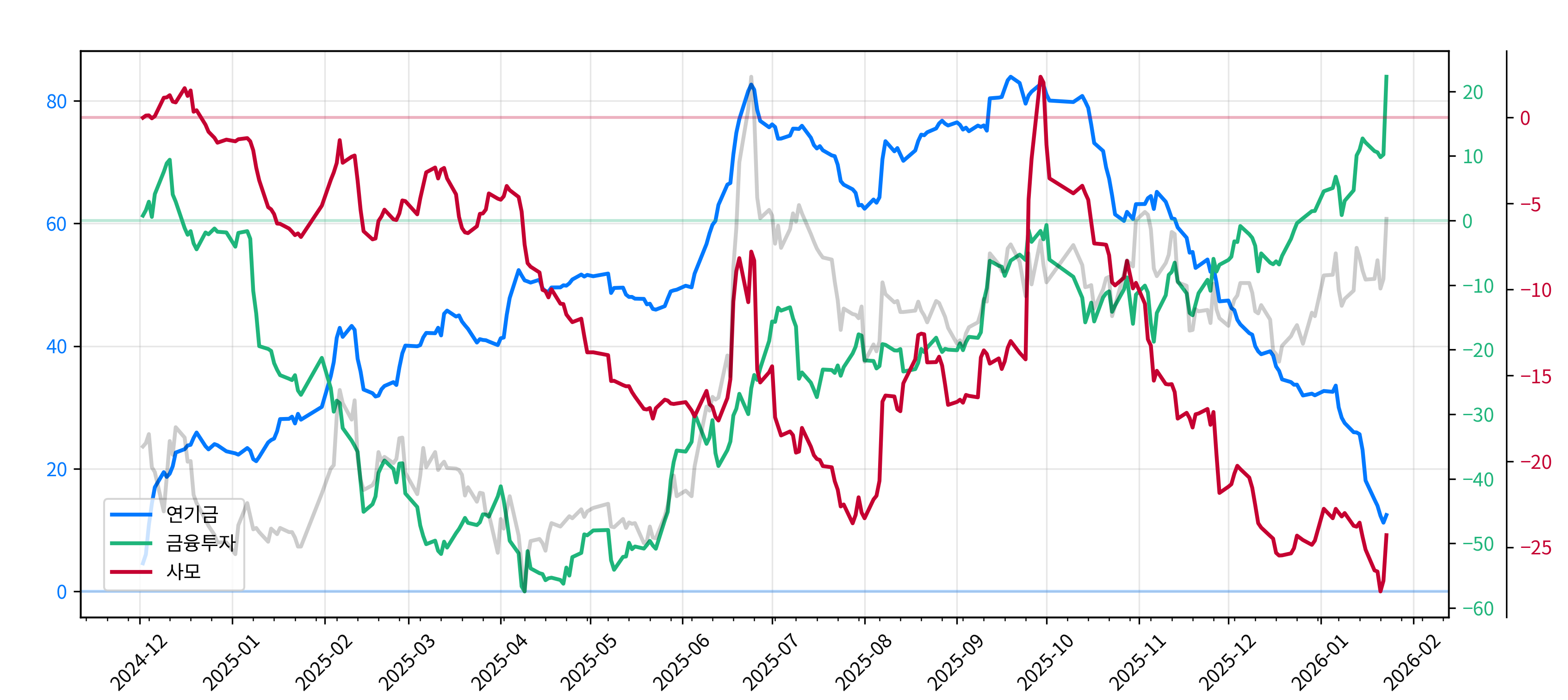 특히 12월 이후 외국인과 금융투자가 함께 포지션을 늘리는 모습이 보이는데도 가격이 탄력적으로 못 움직였다면, 그 배경 가설로는 연기금의 지속적인 매도(포지션 축소)를 먼저 의심해볼 수 있습니다.